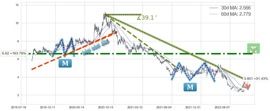 ♘ 阻力价格位6.62,可信任强度92.28%,距离最后交易2022-08-12形成的收盘价格2.510相差 +163.76%