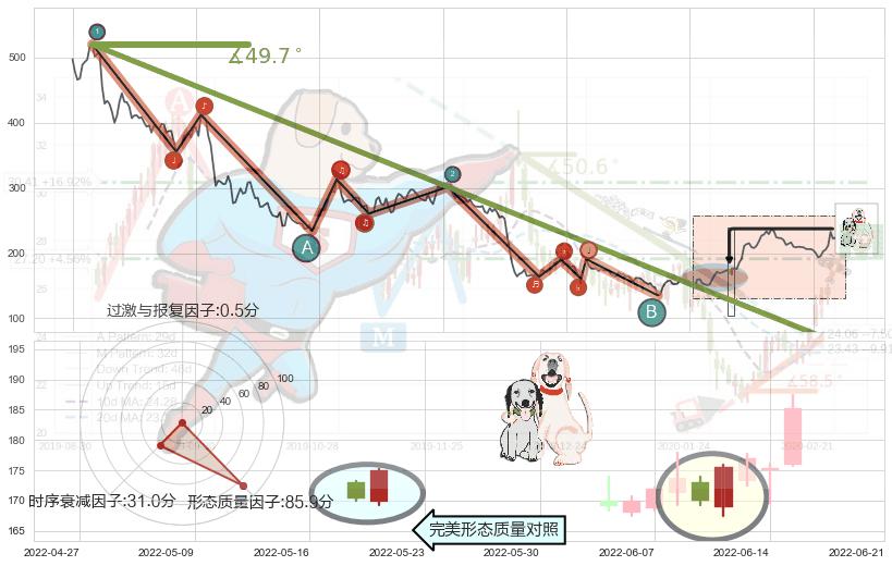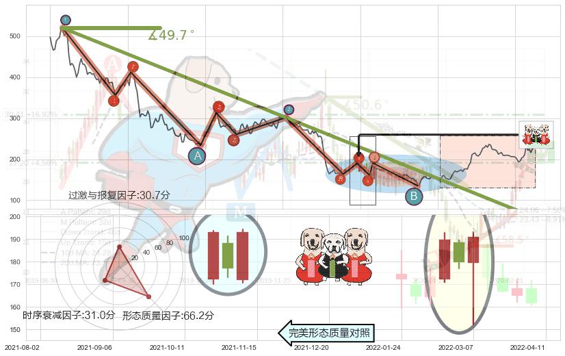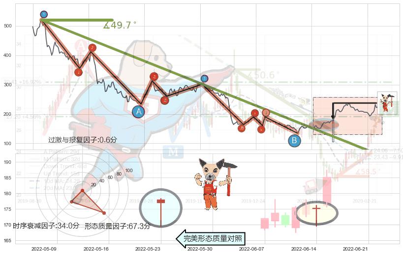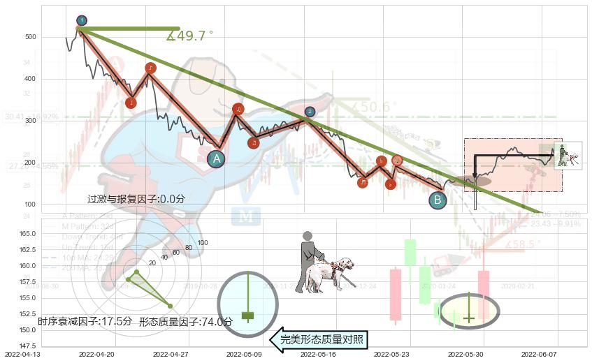 从2021-05-17至2022-04-15,共包含224个交易日,阶段股价下跌-106.23%,阶段股价变动位移路程比: 1 : 5,下跌趋势角度: 49.6