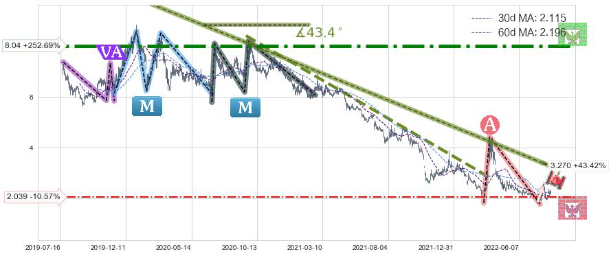 从2020-01-02至2022-07-27,共包含622个交易日,阶段股价下跌-97.92%,阶段股价变动位移路程比: 1 : 13,下跌趋势角度: 43.4
