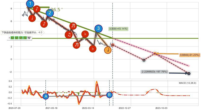 ♘ 在最后的下跌阶段2020-09-10至2022-07-27,存在 持续未破位的阻力位 ,阻力价格3.309,可信任强度85.36%,其距离最后价格2.280相差 +45.14%