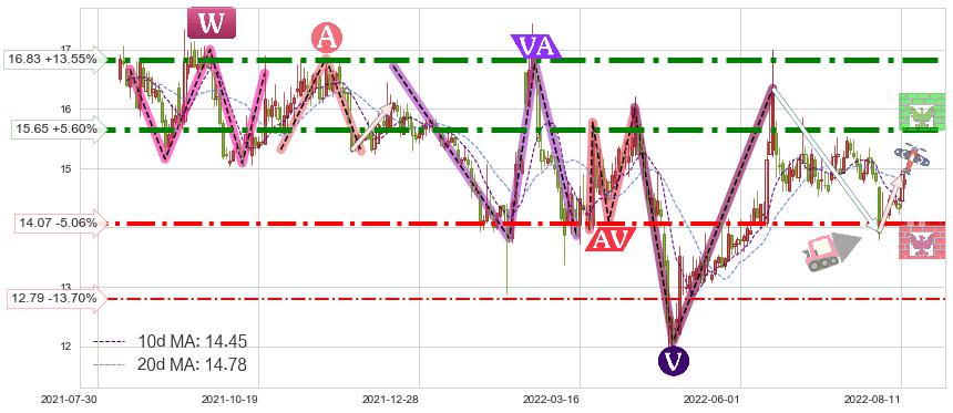 ♘ 阻力价格位15.65,可信任强度93.40%,距离最后交易2022-08-12形成的收盘价格14.82相差 +5.60%