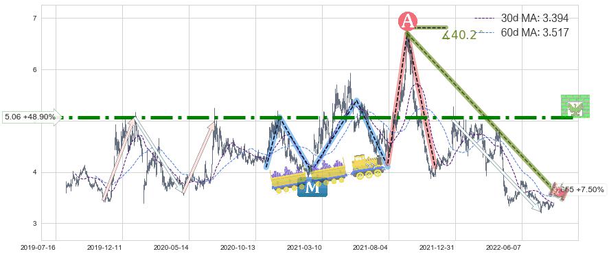 ♞ 30日均线:3.394,60日均线:3.517→ 快线<慢线