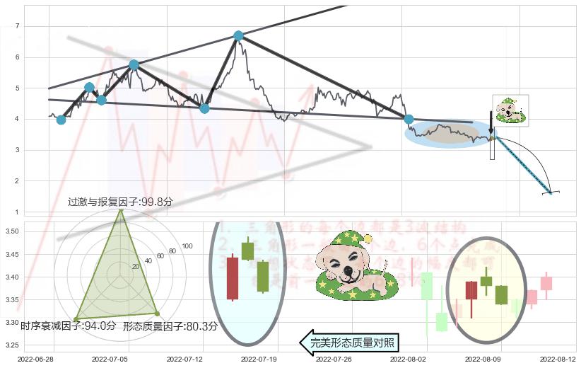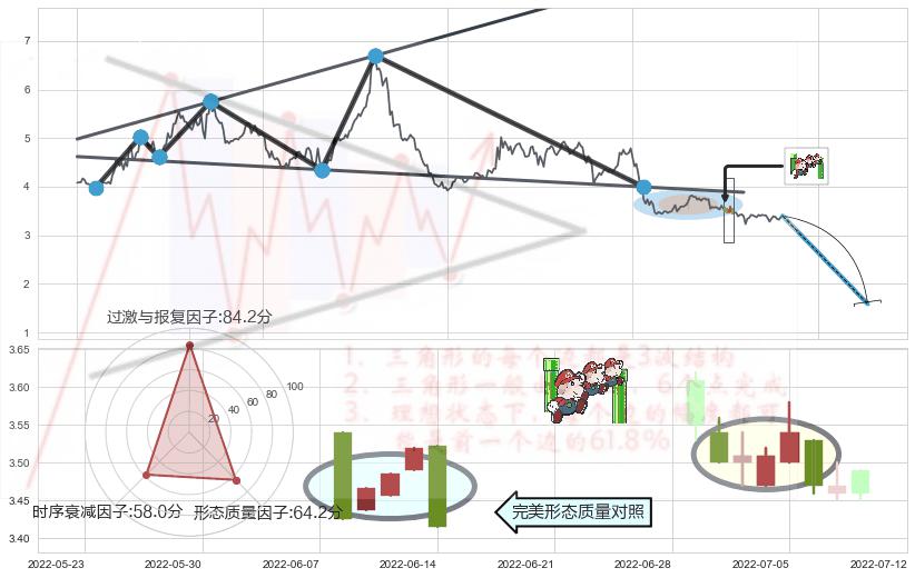➣ 【未确认突破,预测即将形成突破】下降【对称】三角形整理起点:2022-06-06, 预测突破点:2022-08-17,形态共53交易日