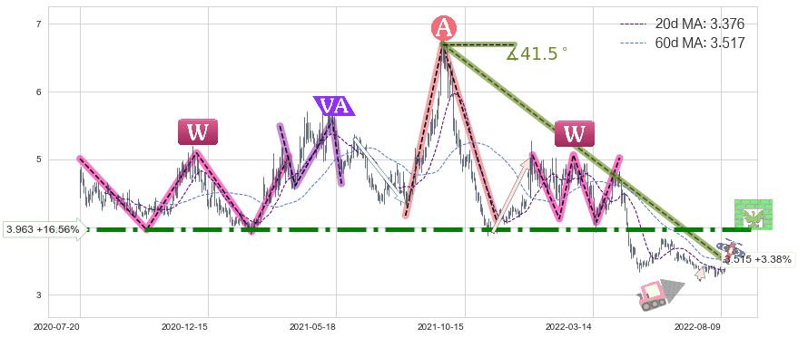 ♘ 阻力价格位3.963,可信任强度85.05%,距离最后交易2022-08-12形成的收盘价格3.400相差 +16.56%