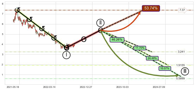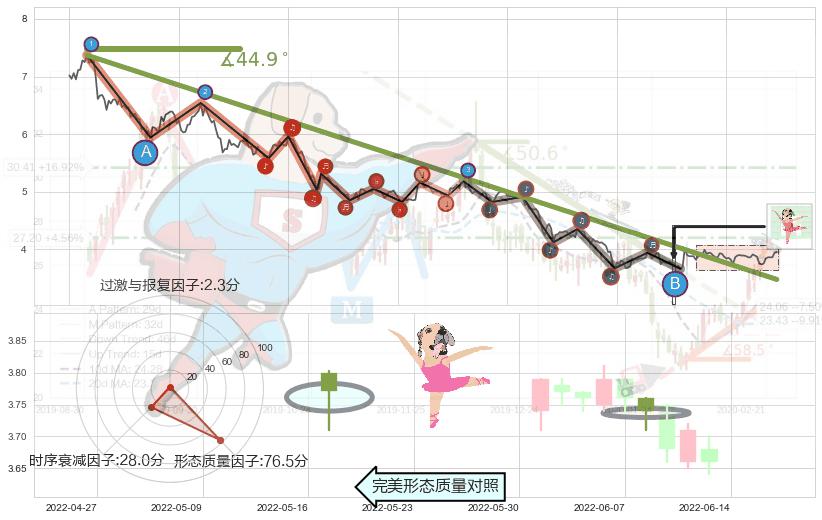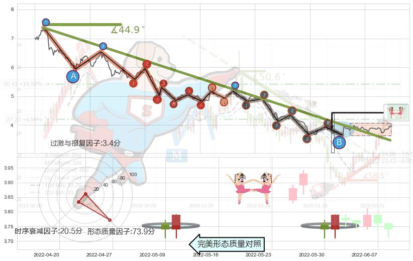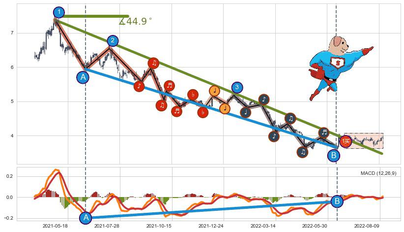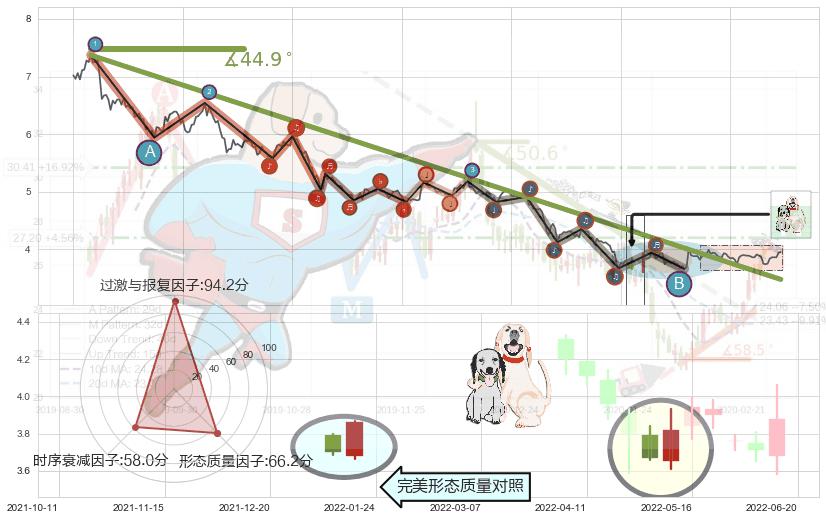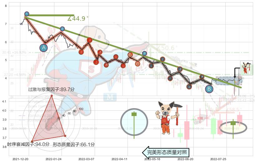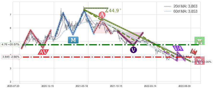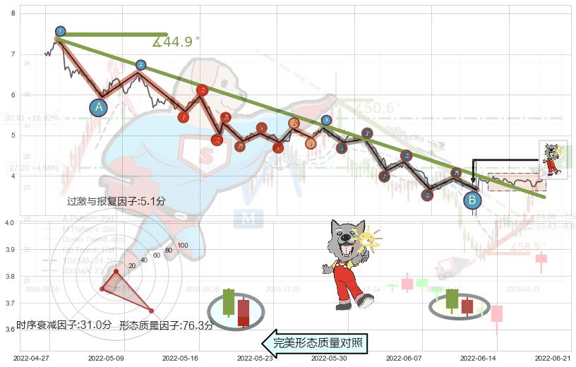 ➣ 2021-04-27-2022-06-14下跌趋势存在反转上涨[机会],其原下跌趋势的阻力位(3.476)已被突破[强支撑信号],原下跌趋势角度: 44.9˚