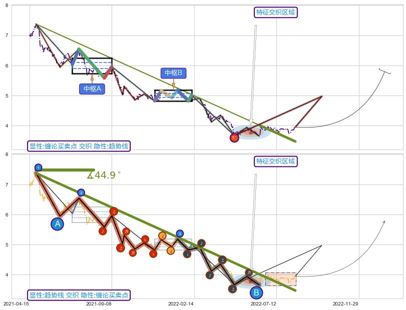 ➣ 缠论买卖点:下降缠中枢AB形成后猜想拐点1买已到达,猜想后续持续拉升(均值回复)