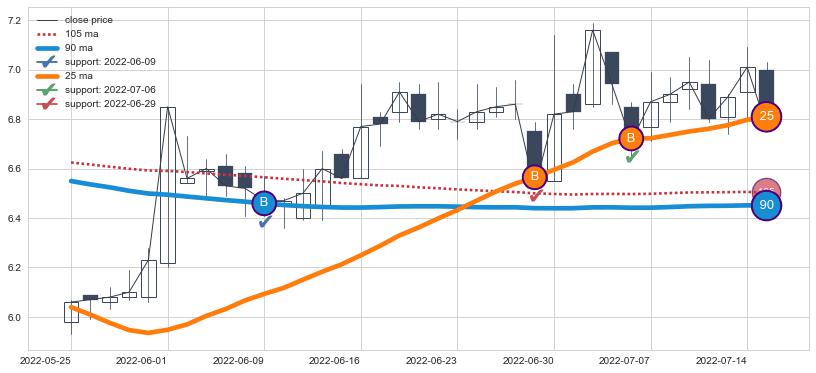 ➣ 25小时均线于(2022-07-18: 6.82)形成【死叉】基于【死叉历史模型】预测死叉后最低波谷价格: 6.23, 死叉后最低价格6.26,尚未达到预测最低波谷价格, 预期继续下跌