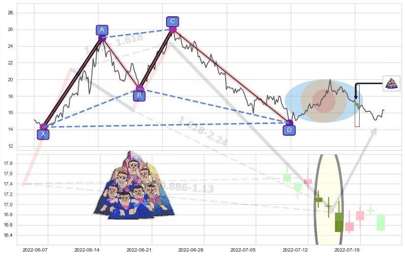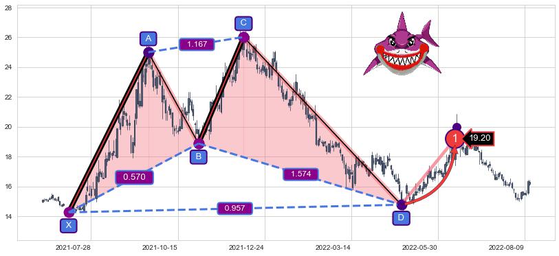 ➣ 谐波鲨鱼:已到达d点:猜想c下行到达d点后报复性拉升上涨(均值回复)