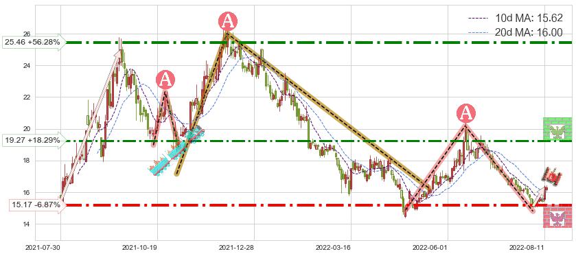 ♘ 阻力价格位19.27,可信任强度65.24%,距离最后交易2022-08-12形成的收盘价格16.29相差 +18.29%