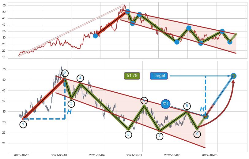 ➣ 降旗形:猜想临近关键阻力位突破点 → 临近拐点上涨 → 机会信号 → 大趋势均值回复
