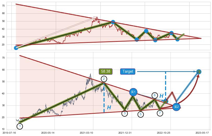 ➣ 上升对称三角整理:猜想临近关键阻力位突破点 → 临近拐点上涨 → 机会信号 → 大趋势均值回复