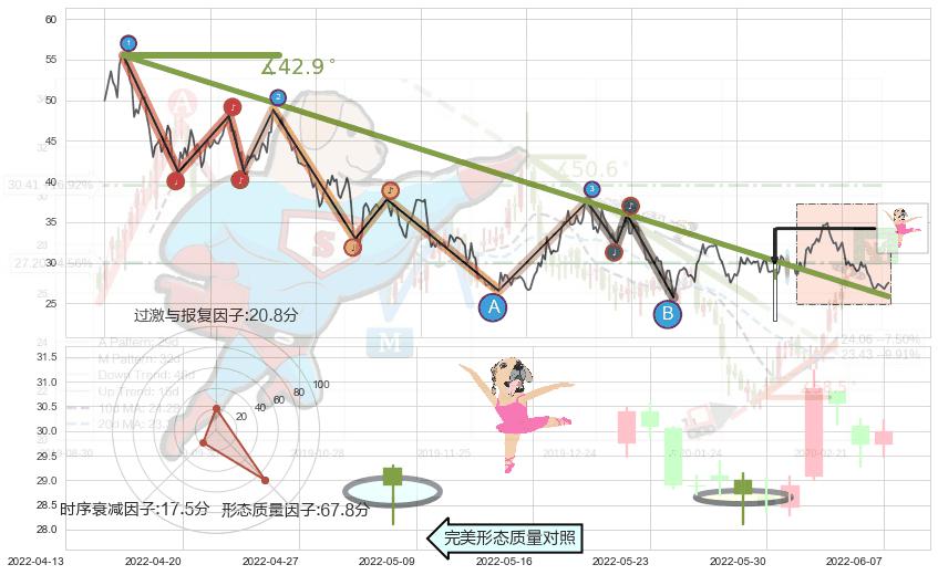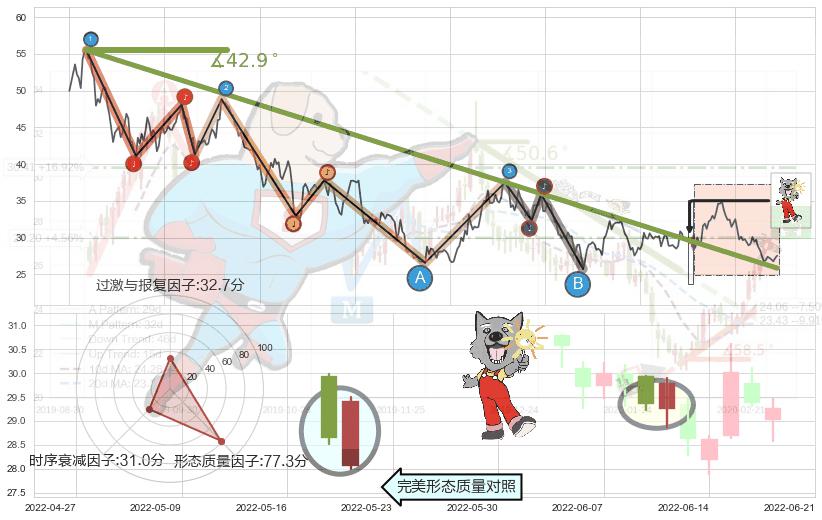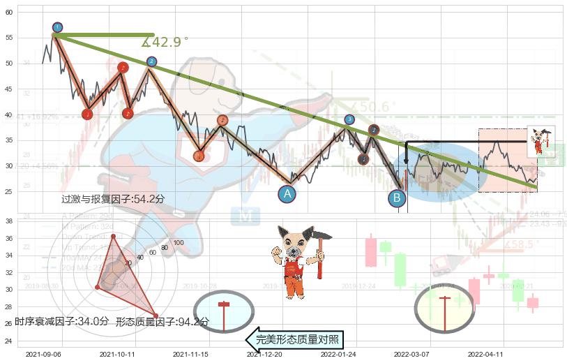 从2021-02-10至2022-04-22,共包含288个交易日,阶段股价下跌-53.73%,阶段股价变动位移路程比: 1 : 12,下跌趋势角度: 42.9