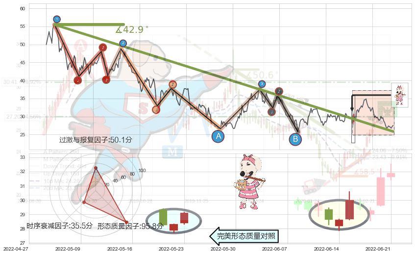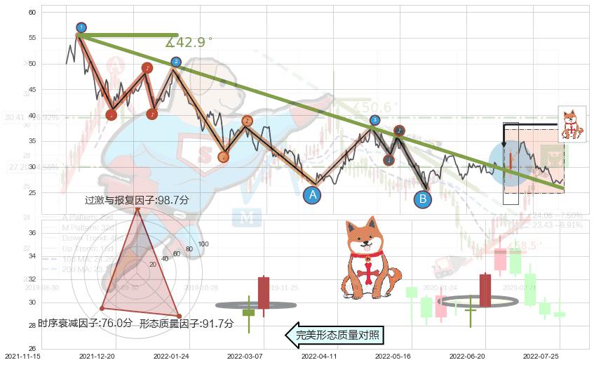 ➢ 2021-02-10-2022-04-22下跌趋势存在反转上涨[机会],虽然原下跌趋势的阻力位(25.85)已被突破,但其阻力效果尚存,原下跌趋势角度: 42.9˚