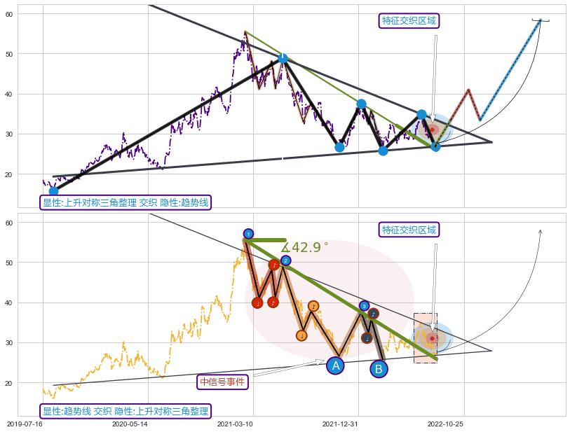 ➢ 上升对称三角整理:猜想临近关键阻力位突破点 → 临近拐点上涨 → 机会信号 → 大趋势均值回复