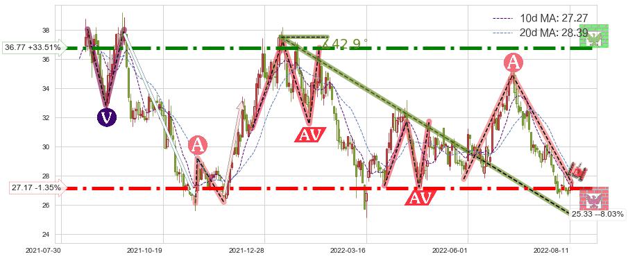 ♘ 支撑价格位27.17,可信任强度90.55%,距离最后交易2022-08-12形成的收盘价格27.54相差 -1.35%