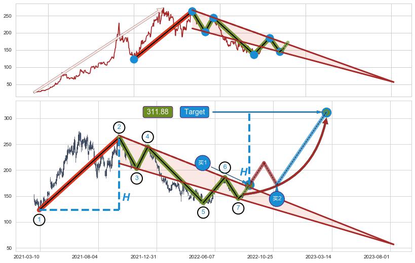 ➣ 降楔型:猜想临近关键阻力位突破点 → 临近拐点上涨 → 机会信号 → 大趋势均值回复