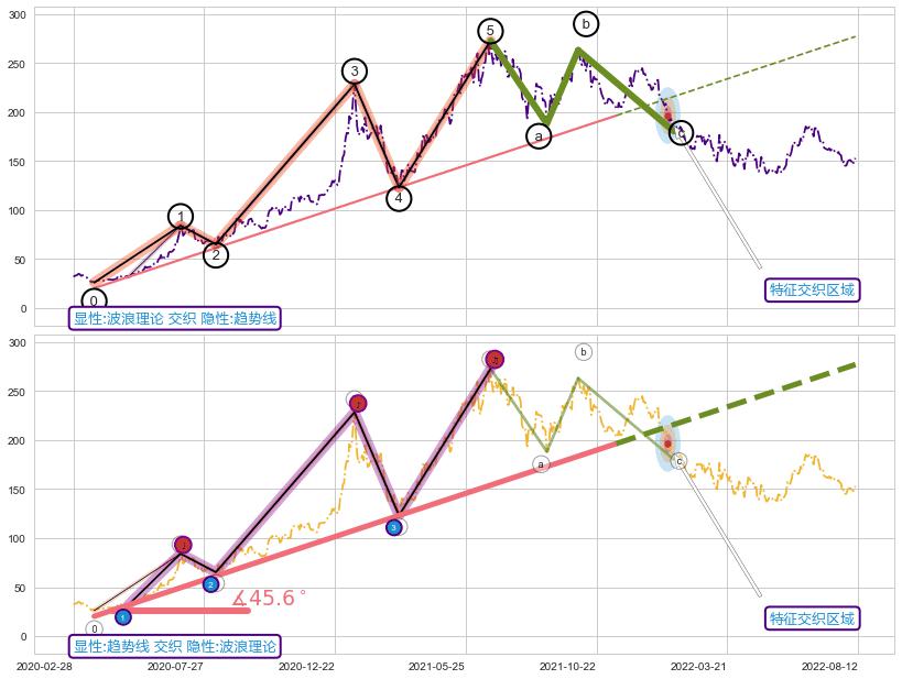 ➢ 波浪理论与趋势线信号事件周期长度级别相同,同周期信号事件