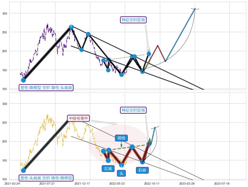 ➢ 头肩底属【中级别信号事件】降楔型属【长级别信号事件】中长周期组合信号事件,中长事件长度比46.86%