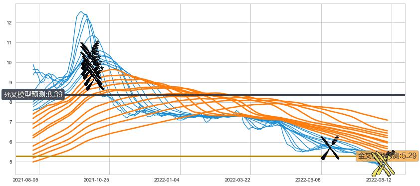 ➣ 80小时均线于(2021-10-08: 9.17)形成【死叉】基于【死叉历史模型】预测死叉后最低波谷价格: 8.97, 死叉后最低价格4.67,已经下跌超出预测最低波谷价格, 预期反弹