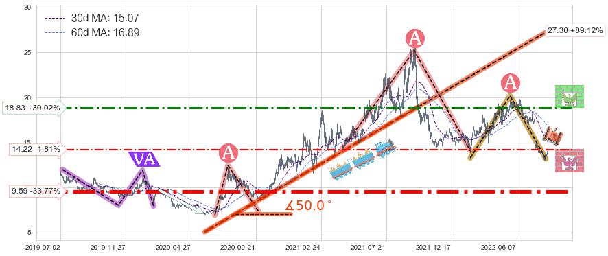 ♘ 支撑价格位14.22,可信任强度51.09%,距离最后交易2022-08-12形成的收盘价格14.48相差 -1.81%