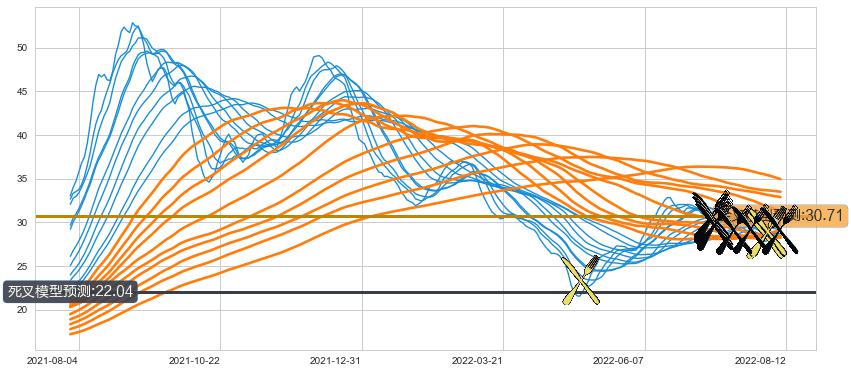 ➣ 34小时均线于(2022-07-08: 30.30)形成【死叉】基于【死叉历史模型】预测死叉后最低波谷价格: 25.43, 死叉后最低价格27.00,尚未达到预测最低波谷价格, 预期继续下跌