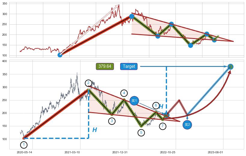 ➢ 最小中继整理涨幅→𝐇: 187.39 (𝐇楔型旗杆的长度:楔型起点→顶点)
