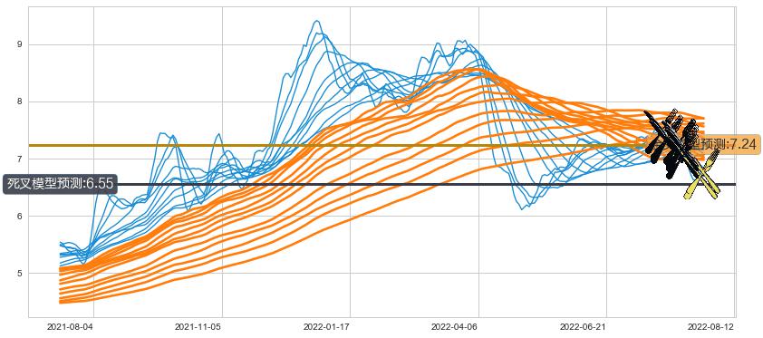 ➢ 70小时均线于(2022-08-01: 7.02)形成【死叉】基于【死叉历史模型】预测死叉后最低波谷价格: 6.60, 死叉后最低价格6.47,已经下跌超出预测最低波谷价格, 预期反弹
