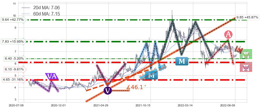 ♘ 阻力价格位6.40,可信任强度47.68%,距离最后交易2022-08-12形成的收盘价格6.75相差 -5.20%