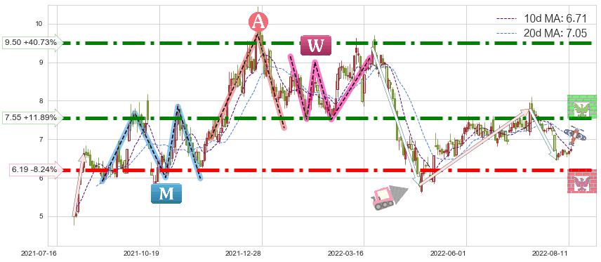 ♘ 阻力价格位7.55,可信任强度90.95%,距离最后交易2022-08-12形成的收盘价格6.75相差 +11.89%