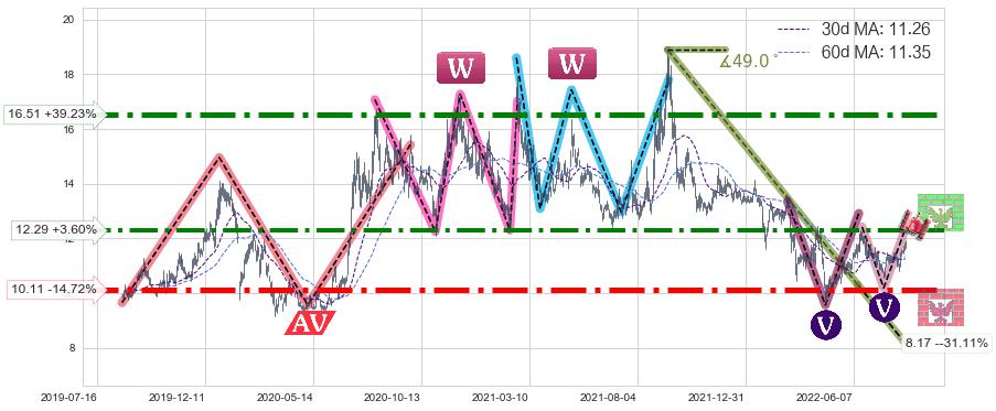 ➢ 【仅预测突破】最后价格:11.86与预测突破价格:12.17→【空间临近】后续最小【反转】第一目标价格→(2022-10-12: 14.51 )