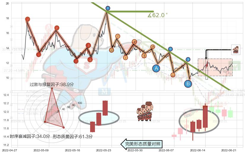 从2021-02-22至2022-06-13,共包含317个交易日,阶段股价下跌-29.61%,阶段股价变动位移路程比: 1 : 19,下跌趋势角度: 62.0