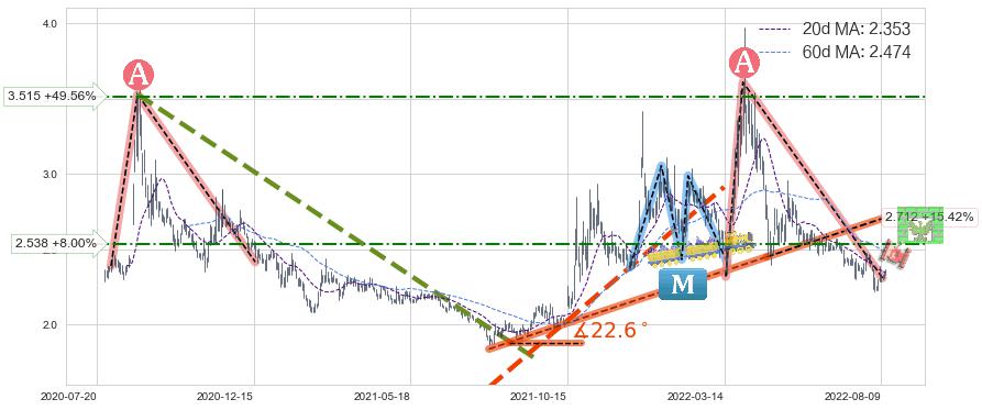 ♘ 阻力价格位2.538,可信任强度51.94%,距离最后交易2022-08-12形成的收盘价格2.350相差 +8.00%