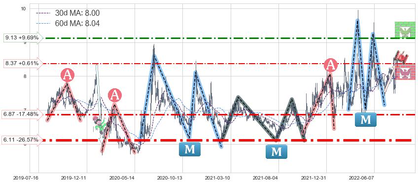 ♘ 支撑价格位8.37,可信任强度50.95%,距离最后交易2022-08-12形成的收盘价格8.32相差 +0.61%
