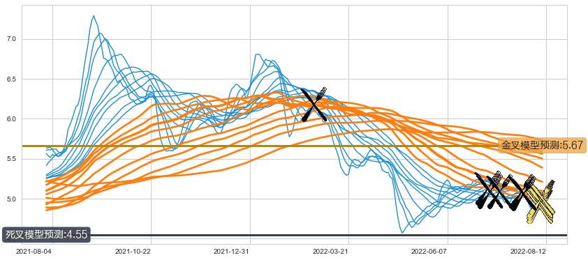➣ 89小时均线于(2022-02-23: 6.17)形成【死叉】基于【死叉历史模型】预测死叉后最低波谷价格: 5.58, 死叉后最低价格4.41,已经下跌超出预测最低波谷价格, 预期反弹
