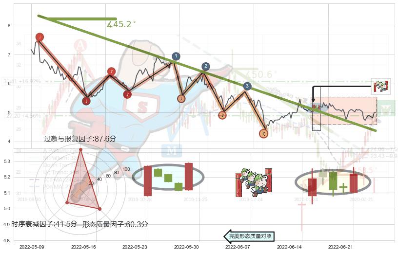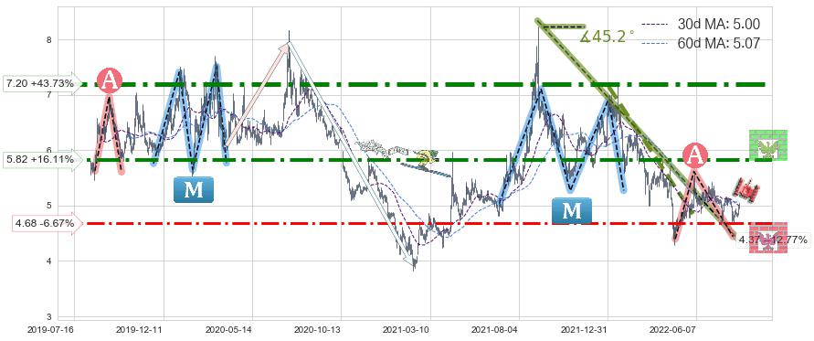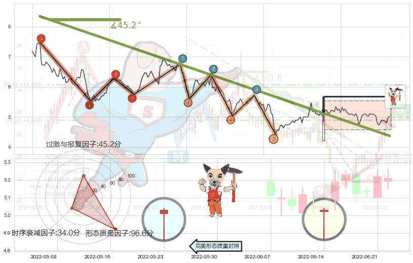 ➣ 2021-09-02-2022-05-31下跌趋势存在反转上涨[机会],其原下跌趋势的阻力位(4.37)已被突破[强支撑信号],原下跌趋势角度: 45.2˚
