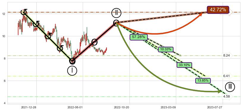 ➣ 循环浪继续向下【平均值】位置(2023-06-06, 6.41),匹配聚类样本比例57.78%, 可能性概率33.10%