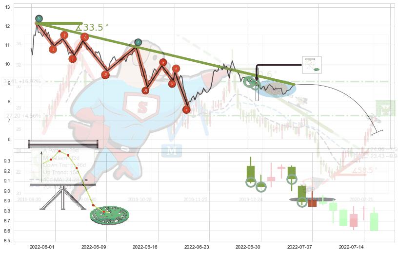 🦴 长线均值回复组合短线趋势跟踪[强阻力信号]2021-11-18-2022-05-25下跌趋势依然成立(下跌趋势跟踪依然存在),短线价格略微上行反弹(均值回复猜想),即将接近下跌趋势提供的未破位阻力价格:8.91。