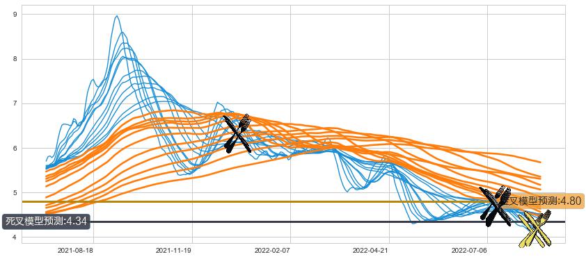 ➢ 21小时均线于(2022-07-08: 4.75)形成【死叉】基于【死叉历史模型】预测死叉后最低波谷价格: 4.42, 死叉后最低价格4.05,已经下跌超出预测最低波谷价格, 预期反弹