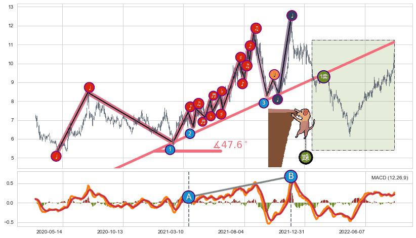 ✂️ 2020-04-29-2022-01-27上升趋势存在反转[风险],其原上升趋势的支撑位(11.13)已破位[强阻力信号],原上升趋势角度: 47.6˚