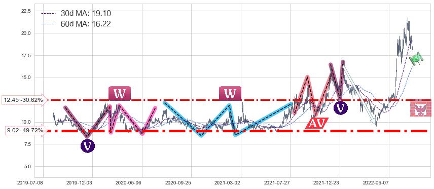 ♘ 支撑价格位12.45,可信任强度60.46%,距离最后交易2022-08-12形成的收盘价格17.95相差 -30.62%