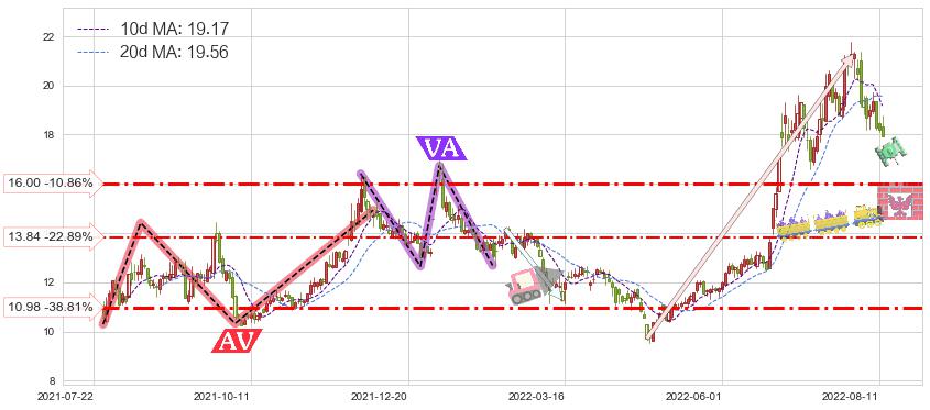 ♘ 支撑价格位16.00,可信任强度67.07%,距离最后交易2022-08-12形成的收盘价格17.95相差 -10.86%