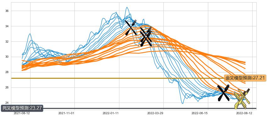 ➣ 40小时均线于(2022-07-08: 25.19)形成【死叉】基于【死叉历史模型】预测死叉后最低波谷价格: 22.21, 死叉后最低价格23.12,尚未达到预测最低波谷价格, 预期继续下跌