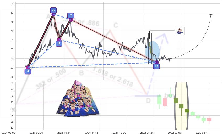 ➢ 谐波蝙蝠:c下跌到达d:猜想拉升 → 上涨 →【拐点】强支撑临近 → 大趋势均值回复