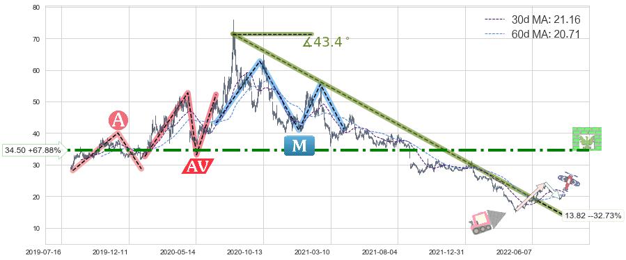 ♘ 阻力价格位34.50,可信任强度83.00%,距离最后交易2022-08-12形成的收盘价格20.55相差 +67.88%
