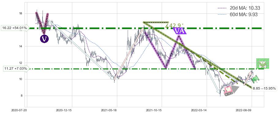 ♘ 阻力价格位11.27,可信任强度63.69%,距离最后交易2022-08-12形成的收盘价格10.53相差 +7.03%