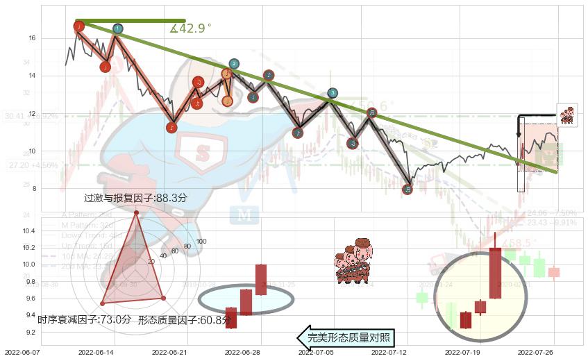 从2021-08-11至2022-06-27,共包含210个交易日,阶段股价下跌-41.17%,阶段股价变动位移路程比: 1 : 8,下跌趋势角度: 42.9