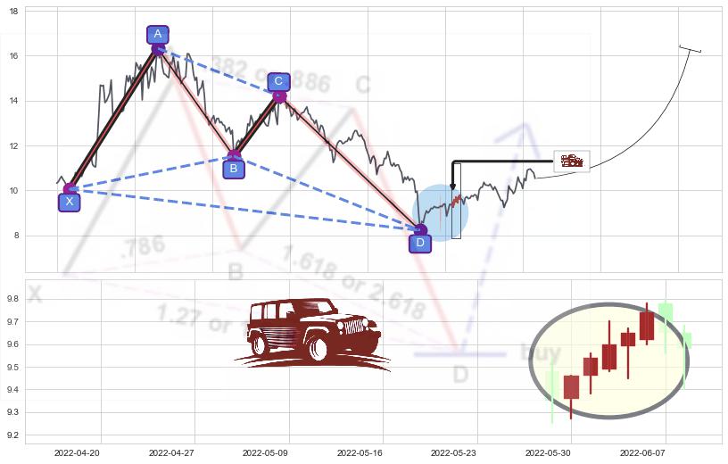 ➢ 谐波蝴蝶:c下跌到达d:猜想拉升 → 上涨 →【拐点】强支撑临近 → 大趋势均值回复