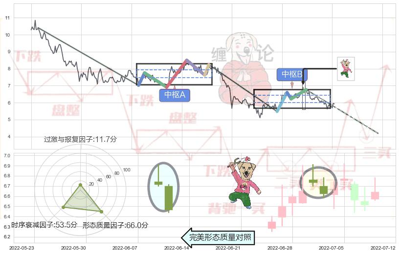 ➢ 【中枢B】:2022-05-24-2022-07-05,中枢由4笔构成,共30交易日, ZG=6.60, ZD=6.22