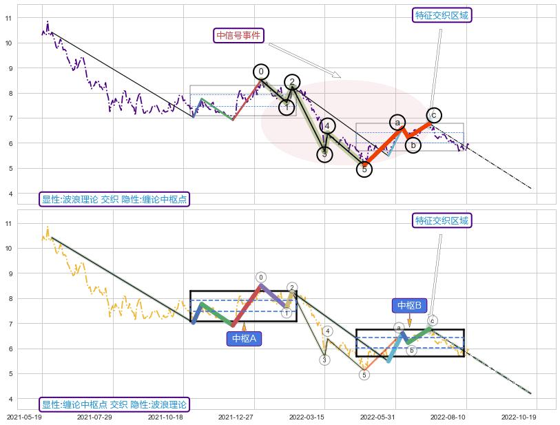 ➣ 缠论中枢点:猜想破位中枢B后持续下拉 → 下跌 → 破位中枢B支撑 → 持续趋势跟踪
