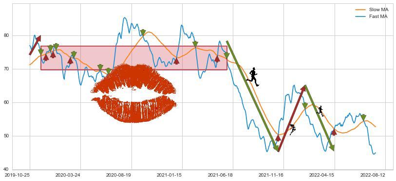 2022-01-14至2022-04-14 慢线与快线呈空头排列, 慢线与快线接触少,无缠绕